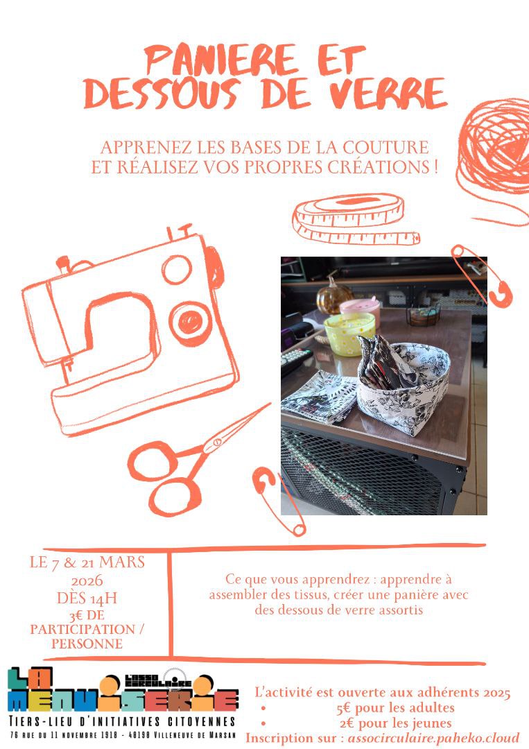 🧵14h - 16h30 | Atelier "Créafil" : projet couture (panière & dessous de verre) proposé par Nathalie ou crochet avec Marion ou encore projet libre.
